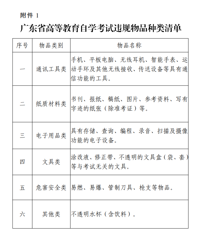 准备考试需要的相关文具,如2B铅笔、黑色字迹的钢笔或签字笔、马克笔、直尺、三角板、圆规、橡皮擦等,除必要文具之外任何物品不准带入考场(《国家高等教育自学考试违规物品种类清单》见附件1)。严禁携带任何通讯工具(如手机、对讲机及其他无线接收、传送设备)、智能手表、运动手环、电子记事本、电子存储记忆录放设备、照相机、涂改液、修正带等与考试无关的物品进入考场。